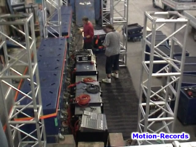 The total length of our truck was 24m and our alternator was able to make 160KVA (KW) of electricity. The sound system was the most powerful one of all trucks on the parade: 48 Stacks Turbosound PA with about 50.000W power output ! With each kick drum the people "jumped" almost automatically :-). For light effects we had some Strobos, eight-Lights and ACL systems.